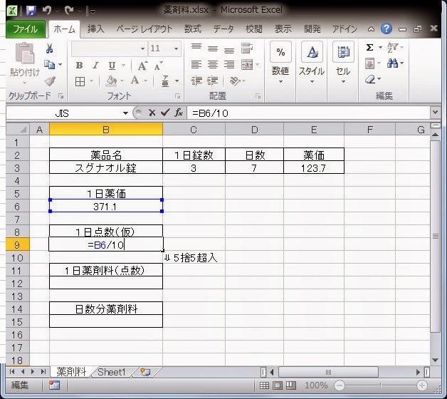 これを組み合わせて1日薬剤料の空欄に「=IF(B9-INT(B9)>0.5,INT(B9)+1,INT(B9))」と入力下さい。