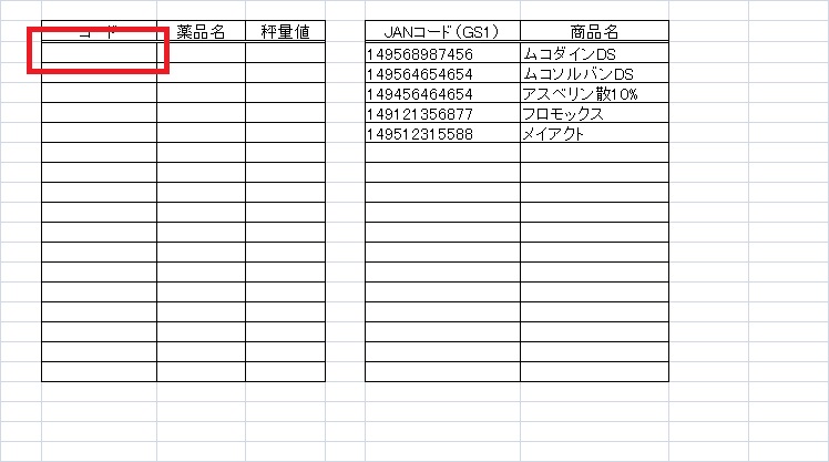 左の表のJANコードの欄にカーソルをあててバーコードリーダーでスキャンすればJANコードが自動で入力されるはずです。すると右のセルに薬品名がでます。