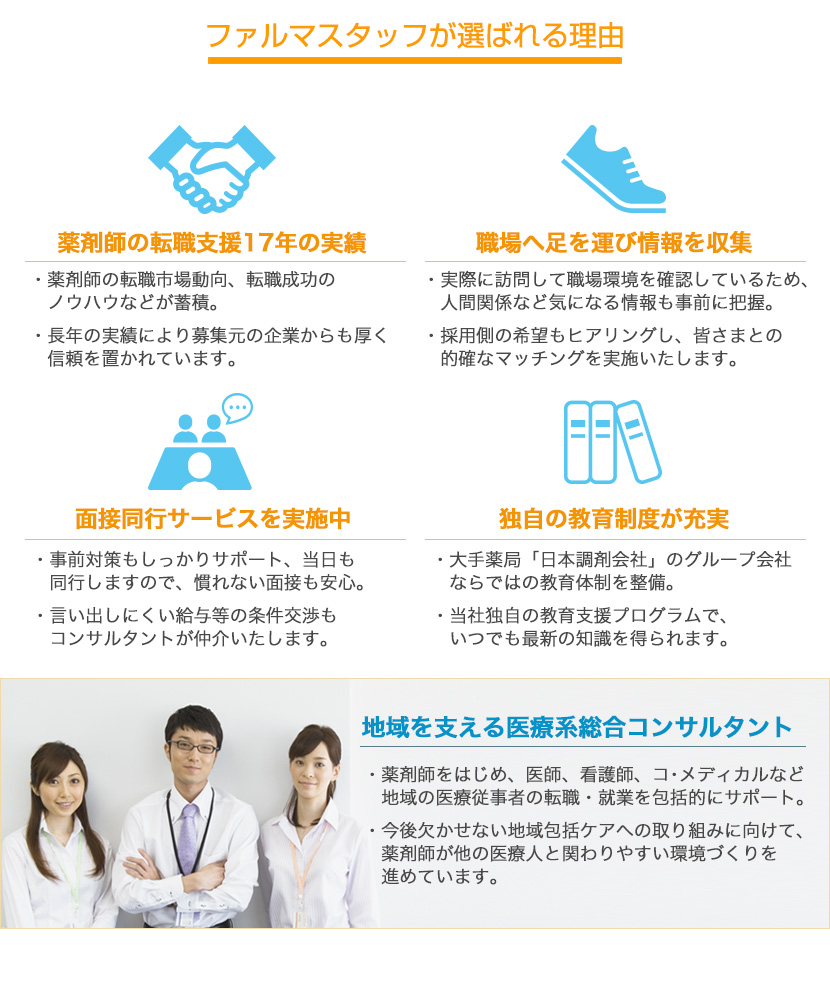 とにかくキャリコンサルタントのレベルが高い!!ファルマスタッフのスゴいところは1つ1つの就業先にキャリアコンサルタントが必ず直接訪問し、職場の状況を具体的にヒアリングしています。その過程でブラック薬局や経営が怪しい薬局は排除されます。